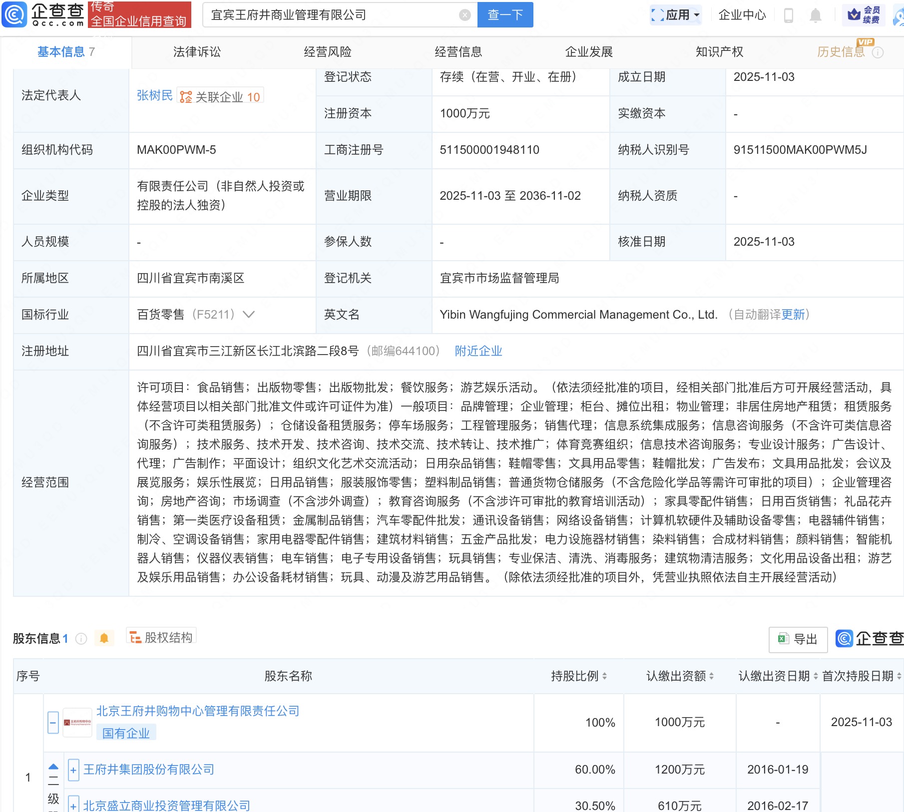 近日,宜宾王府井商业管理有限公司成立,法定代表人为张树民,注册资本1000万人民币,经营范围含信息技术咨询服务、专业设计服务、企业管理咨询、房地产咨询等。企查查股权穿透显示,该公司由王府井(600859)旗下北京王府井购物中心管理有限责任公司全资持股。